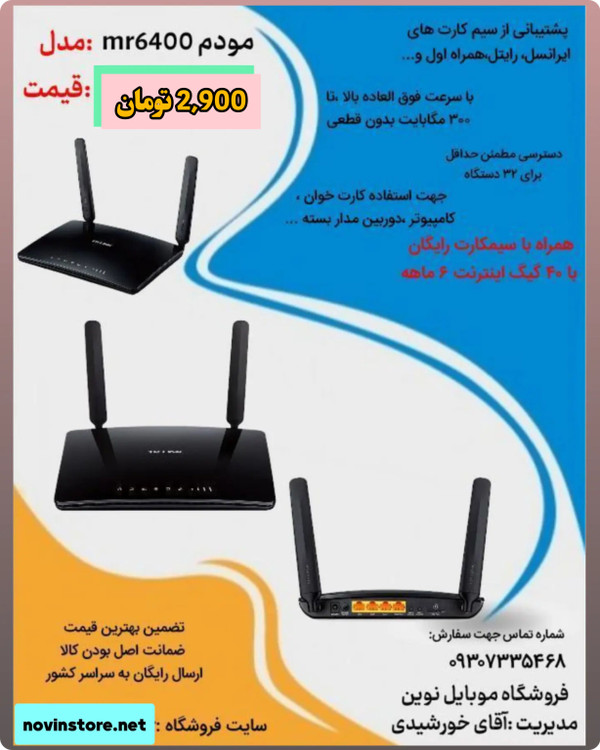 مودم MR6400 یک محصول با کیفیت از شرکت تیپی-لینک (TP-LINK) است که تنها با قرار دادن یک سیم کارت نسل چهارم (4G) در آن میتوانید از اینترنت پرسرعت استفاده کنید. این مودم روتر از دو آنتن با 2.4 گیگاهرتزی داخلی برای ایجاد شبکه Wi-Fi و دو عدد آنتن بیرونی برای اتصال به آنتنهای BTS اپراتور بهره می برد و با این ترکیب این دو مجموعه آنتن، میتواند اینترنت سیمکارت شما را به صورت بیسیم در محیط اطرافتان ارایه دهد. برای استفاده از MR6400 تنها کافی است که سیمکارت خود را در مکان مشخص شده قرار دهید و به کمک آداپتور 12 ولتی موجود در جعبه، محصول آن را به برق شهری متصل کنید. در پنل پشتی مودم روتر، چهار عدد پورت LAN از نوع 10/100 مگابیتی وجود دارد که یکی از آنها پورت LAN/WAN است. این پورت به شما کمک میکند دستگاههایی از قبیل مودم کابلی (فاقد قابلیت وایرلس) را به این دستگاه جدید وصل و به کمک آن حتی از اینترنت ADSL هم استفاده کنید. بدون شک مودم 4G تیپی-لینک مدل MR6400 یک محصول نیمه حرفهای است که در واقع نسخهی ساده شدهی Archer MR200 از همین برند است. تفاوت اصلی این دو مدل، پشتیبانی از شبکه بیسیم 5 گیگاهرتز و استاندارد IEEE 802.11ac در مدل Archer MR200 است که در مدل MR6400 به شبکه 2.4 گیگاهرتز و استاندارد IEEE 802.11n تقلیل پیدا کردهاست.